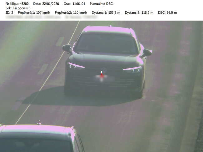Do przeprowadzonych na drodze ekspresowej S-5 22.01.2026 roku działań, bydgoscy policjanci wykorzystywali urządzenie pomiarowe TruCAM II, wyposażone w funkcję DBC (Distance Between Cars). Ta funkcja umożliwia precyzyjny pomiar odległości pomiędzy pojazdami poruszającymi się drogą ekspresową. Sprzęt ten pozwala na rejestrowanie obrazu oraz przekazywanie materiału dowodowego do patrolu znajdującego się na kolejnym odcinku trasy. Tam policjanci zatrzymują kierowców, którzy nie stosują się do przepisów i pokazują im zarejestrowane wykroczenie na ekranie terminala.