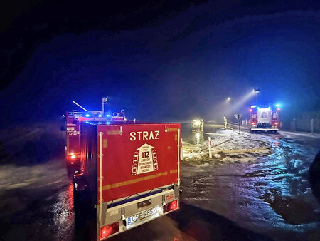Działania prowadzone były w trudnych warunkach – przy niskiej temperaturze, ograniczonej widoczności oraz śliskiej nawierzchni. Strażacy pracowali w specjalistycznych ubraniach ochronnych, dbając o własne bezpieczeństwo oraz o to, by nie dopuścić do uszkodzenia infrastruktury posesji.